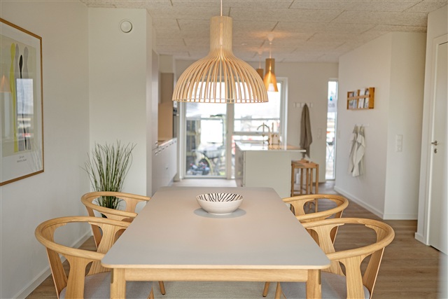Denne attraktive bolig er designet til både dagligdagens rutiner og til at skabe gode oplevelser. Boligen præsenterer sig med en stilren carport, hvor der er direkte adgang til et tilhørende skur. Dette skur tilbyder praktisk opbevaringsplads og sikrer en tryg ankomst til hjemmet. Foran huset findes et areal, der egner sig til at indrette et hyggeligt uderum, ideelt til morgenkaffen eller til at dyrke små grønne planter.Når man træder indenfor, mødes man af en lys entre, som giver adgang til et af hjemmets to badeværelser. Herfra åbner boligens centrale rum sig - det indbydende køkken-alrum. Køkkenet er udført i en varm beige nuance og forsynet med en elegant, hvid bordplade i sten. Opdelingen i både en køkkenø og en køkkenniche skaber separate funktionelle zoner, hvor det er muligt både at tilberede mad og socialisere. Alle nødvendige hvidevarer, herunder opvaskemaskine, følger naturligvis med. Tilknyttet køkkenet er der god plads til et spisebord, og den åbne forbindelse til stuen giver et lyst og indbydende opholdsrum, som er yderst nemt at indrette. Fra stuen er der direkte adgang til en stor, privat terrasse, hvor sommermånedernes varme kan nydes fuldt ud. Under trappen gemmer der sig et praktisk depotrum, der er velegnet til opbevaring af forskellige ting.