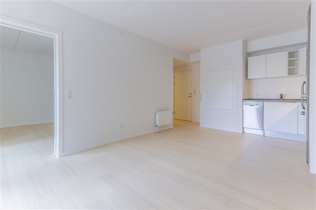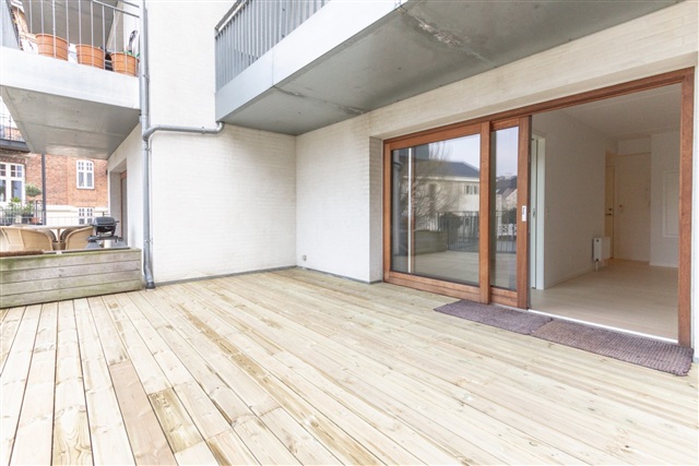 Denne charmerende og lyse lejlighed, som er beliggende centralt i Hellerup, tilbyder en fredelig tilværelse med god privathed i en tilbagetrukket bygning på Strandvejen. Boligen er en 2-værelses lejlighed på 57 kvadratmeter, som fremtræder elegant med hvidmalede vægge og lyse gulve, der løber ensartet fra køkken-alrummet til soveværelset.Lejlighedens største attraktion er den rummelige private terrasse. Store skydedøre i både stue og soveværelse, der går fra gulv til loft, skaber en flydende overgang mellem inde- og udearealer og giver et harmonisk samspil. Terrassen indbyder til mange hyggelige stunder på varme sommeraftener og kan nemt indrettes med forskellige typer udendørsmøbler og planter.