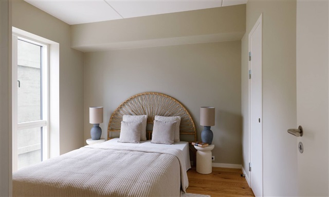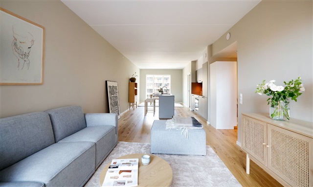 Denne lyse og funktionelt indrettede lejlighed på 4 værelser byder på højt til loftet og en gennemtænkt planløsning, hvor et åbent køkken-alrum fungerer som et centralt samlingspunkt med plads til både spiseplads og et hyggeligt opholdsområde. Lejligheden indeholder desuden tre rummelige soveværelser. Store vinduespartier sikrer godt dagslys og giver udsyn til den omkringliggende natur, mens gulvene er belagt med flot egetræsparket og forsynet med gulvvarme. Fra køkken-alrummet er der direkte adgang til en fredelig, grøn gårdhave.Det lyse køkken, designet af Rotpunkt, fremstår i en varm grå tone og er fuldt udstyret med hårde hvidevarer, herunder induktionskogeplade, kombineret køle- og fryseskab, indbygningsovn samt opvaskemaskine. Badeværelset er beklædt med elegante grå fliser og indeholder en separat bruseniche samt integration af vaskemaskine og tørretumbler.