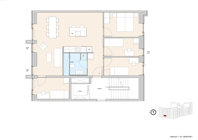 De 5-værelses lejligheder har et moderne køkken med hårde hvidevarer, herunder opvaskemaskine. Badeværelset har både vaskemaskine og tørretumbler, og den rummelige planløsning giver god plads til familieliv, ophold og hjemmearbejde.