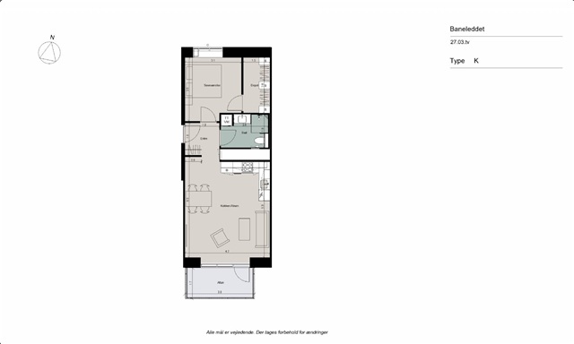 Denne bolig præsenterer sig med en separat, lys entré, der giver rigelig plads til overtøj og fungerer som en central passage til lejlighedens øvrige rum. Fra entréen træder man ind i et rummeligt soveværelse, som uden problemer kan rumme en stor seng. Herfra er der desuden adgang til et depotrum, der med fordel kan omdannes til et walk-in-closet, hvis ønsket. Badeværelset, som også tilgås fra entréen, fremstår i et tidløst og stilrent design; det er rummeligt og udstyret med en separat bruseniche samt vaskemaskine og tørretumbler til praktisk brug. I det åbne køkken-alrum udfolder der sig et stort, lyst rum med et moderne, hvidt køkken udstyret med køle-/fryseskab, ovn, kogeplader, emhætte og opvaskemaskine. Her er desuden rigeligt med skabsplads. Stuen er indrettet med gode muligheder for både en sofaafdeling og et spiseområde, og den fører videre ud til en stor vest- og sydvendt altan eller terrasse, hvor man kan nyde solens varme samt frisk luft samtidig med, at udsigten spænder ud over det nærliggende villaområde.I hele lejlighedens areal findes gulvvarme, som kan tilpasses individuelt i det enkelte rum.