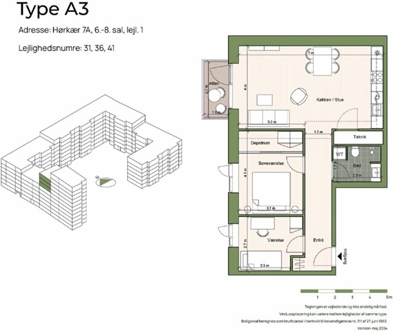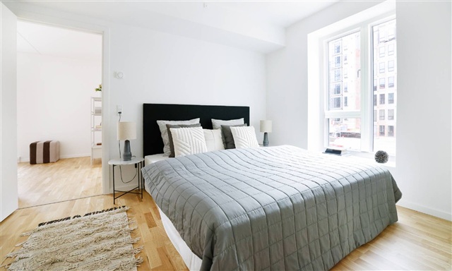 Lejligheden byder på en gennemtænkt og veludnyttet planløsning, hvor du først mødes af en entré, der fungerer som boligens indgangsparti. Fra denne åbnes der op til det rummelige køkken-alrum, hvor det elegante, hvide Svane-køkken danner en flot kontrast til de varme egetræsparketgulve, som er udstyret med gulvvarme. Køkkenets inventar inkluderer komplette hårde hvidevarer, herunder kogeplade, køle-/fryseskab, indbygningsovn og opvaskemaskine. Det lyse og luftige køkken-alrum er stort nok til både at rumme en spiseplads i tilknytning til køkkenet samt et hyggeligt hjørne til stuen. Herfra er der adgang til en stor altan med sydvendt placering, hvor solens varme kan nydes i fulde drag - ideelt til afslapning med en forfriskende drik eller en kop kaffe. Lejlighedens soveværelse er rummeligt og har plads til både seng og opbevaringsløsninger. Tilknyttet soveværelset findes et depotrum med indbyggede skabe, der giver ekstra plads til opbevaring. Det ekstra værelse kan udnyttes fleksibelt alt efter behov, hvad enten man ønsker et kontor, gæsteværelse eller børneværelse. Badeværelset er beklædt med store, grå fliser og indeholder en separat bruseniche. Her er også installeret vaskemaskine og tørretumbler for ekstra funktionalitet.Det skal bemærkes, at billederne kan være taget i en anden lejlighed, hvilket betyder, at indretning, udsigt og beliggenhed kan afvige. Dog er materialevalg og kvalitetsniveau identisk for samtlige boliger i ejendommen. Den præcise indretning kan ses på plantegningen for denne bolig.