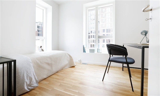 Lejligheden byder på en rolig og indbydende stemning, som gennemstrømmer samtlige rum. Denne rummelige 4-værelses bolig er udformet med en velovervejet planløsning og prydes af store vinduespartier, der sikrer et smukt og naturligt lysindfald. Gulvvarme bidrager til en behagelig komfort under fødderne. Ved indgangen mødes man af en praktisk entré med plads til ophængning af overtøj og opbevaring af sko. Herefter ledes man videre ind i det åbne køkken-alrum, hvor et elegant hvidt Svane-køkken står i kontrast til de varme egetræsparketgulve. Køkkenet er fuldt udstyret med moderne hårde hvidevarer, herunder kogeplade, køle-/fryseskab, indbygningsovn samt opvaskemaskine. Det kombinerede køkken- og spiseområde giver rigelig plads til en spiseafdeling, mens stueområdet indbyder til afslapning i sofaen. Fra alrummet er der udgang til en stor altan med udsigt mod den stille gårdhave, hvor solskinstimer og udeliv kan nydes med et koldt glas i hånden. Det rummelige soveværelse har plads til både seng og opbevaringsmøbler, og i forlængelse heraf findes et depotrum med indbyggede skabe, som skaber ekstra opbevaringsmuligheder. Ud over soveværelset findes der to yderligere værelser af forskellig størrelse, der egner sig til enten delelejlighed, kontor eller børneværelse. Badeværelset er forsynet med separate brusefaciliteter og lagt med store, grå fliser. Desuden er der installeret både vaskemaskine og tørretumbler. Det skal bemærkes, at de viste billeder kan stamme fra en anden bolig, og dermed kan indretning, udsigt og placering variere. Materialevalget og kvaliteten er dog ensartet for alle lejligheder i ejendommen. Plantegningen giver et detaljeret indblik i lejlighedens opbygning.Ejendommen udgør en smuk karré med ideelle rammer for fællesskab, der tager udgangspunkt i de fælles faciliteter som gårdhaven, fælleshuset og orangeriet. Arkitektfirmaet C.F. Møller Architects har designet byggeriet, som omfatter 264 lejligheder med fleksible størrelser fra 2 til 5 værelser, tilpasset forskellige behov og familietyper. I gårdhaven findes blandt andet et hyggeligt fælleshus sammen med et tilhørende orangeri, der både er designet til at fremme trivsel og styrke sociale relationer i bebyggelsen. For beboere er der mulighed for at ansøge om en parkeringstilladelse til en pris på 400 kr. pr. måned. Hørkær Have er på vej mod DGNB guld-certificering, hvilket betyder, at der er stort fokus på bæredygtighed, miljø og beboernes sundhed. Ejendommen er blandt andet bygget med miljøvenlige materialer, og der er lagt vægt på et godt indeklima samt attraktive fællesarealer, der bidrager til en høj livskvalitet.