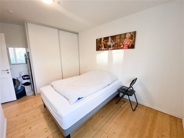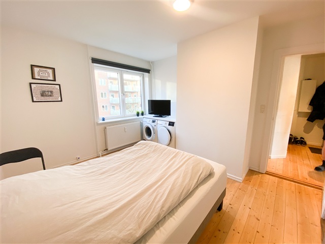 Soveværelset er indrettet med funktionalitet for øje og rummer et stort indbygget klædeskab samt et praktisk hjørne, hvor både vaskemaskine og tørretumbler er placeret. Der er tilstrækkelig plads til en stor seng samt mulighed for f.eks. et skrivebord. Vinduet i dette rum vender ud mod en fredelig gårdhave, hvilket skaber en rolig stemning.