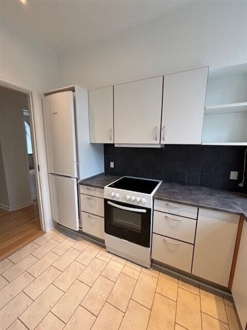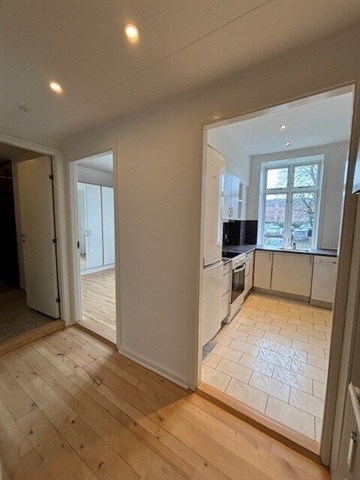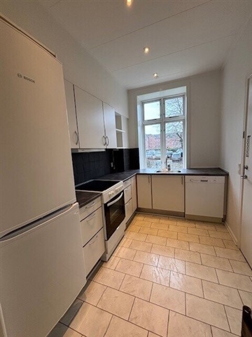 Denne lejlighed, der er yderst centralt placeret, rummer to værelser og giver mulighed for at tilkøbe en parkeringsplads. Indenfor mødes man af en rummelig entré med rigelig plads til garderobeskabe. Køkkenet fremstår lyst og velholdt med talrige skabe, kølefryseskab, et nyere komfur samt en integreret opvaskemaskine. Badeværelset er udstyret med en pæn bruseniche, mens soveværelset har en komplet skabsvæg til opbevaring. Stuen er stor og lys, hvilket bidrager til en behagelig atmosfære. Lejligheden er udstyret med spots i bad, køkken og entre, og gulvene er nylakerede trægulve. Derudover findes dørtelefon, systemnøgle, et gratis vaskeri samt et disponibelt kælderrum.