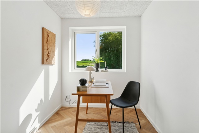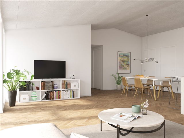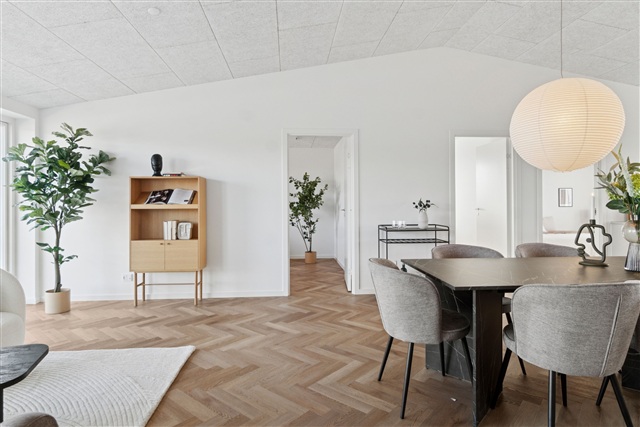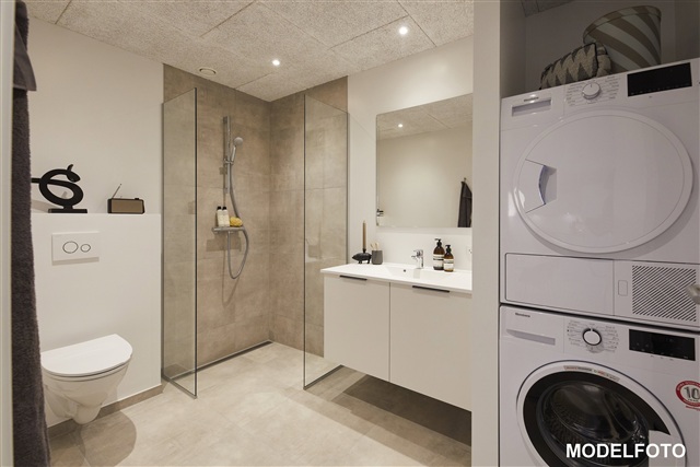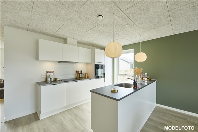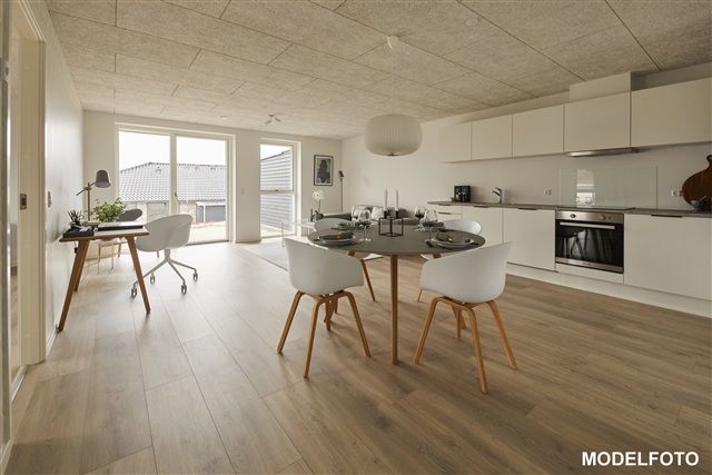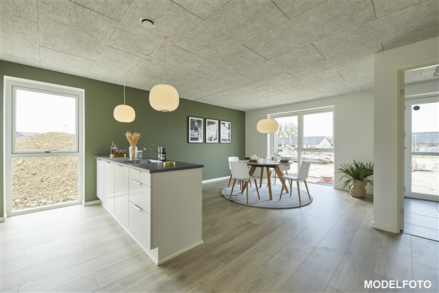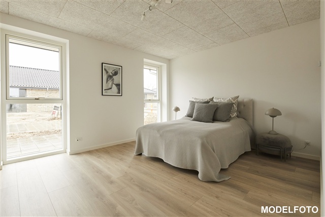 Hver bolig er præget af lyse og åbne rum med lyddæmpende træbetonlofter og glatte, hvide vægge. Vinduerne er store og åbne, hvilket sikrer rigeligt naturligt lys i hele hjemmet. Opholdsområderne, som køkken-alrum og stue, har vinduespartier ned til gulvhøjde, der maksimalt udnytter lyset. Gulvene er belagt med lys egelaminat i både opholdsrum og værelser, mens entré, bryggers og badeværelse får grå klinker, der er både elegante og praktiske. Alle døre fremstår med en glat, hvid finish, rustfri stålgreb og monteres uden dørtrin for optimal tilgængelighed. Fodpanelerne er også hvide og glatte.