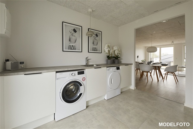 Alle hvidevarer er inkluderet og kommer fra Electrolux, hvor blandt andet et integreret køle-/fryseskab, opvaskemaskine, induktionskogeplade, emhætte og indbygningsovn med Aqua-Clean-funktion er standard. Vaskemaskine og tørretumbler placeres i entré eller bryggers.