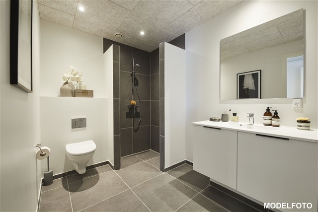 Boligernes inventar består af moderne HTH-moduler i mat hvid med linjegreb i antracitgrå, som anvendes i køkken, bad, bryggers og soveværelse. Bordpladerne er af laminat i farven 'mørk metal' med rummelige stålvaske. Bag kogepladen monteres en stænkplade for lettere rengøring. Badeværelset har en formstøbt vask, væghængt Ifö Sign-toilet samt armaturer af høj kvalitet fra tyske Hans Grohe. Brusenichen er udført med linjeafløb for et moderne udtryk.