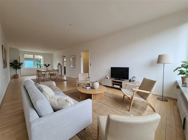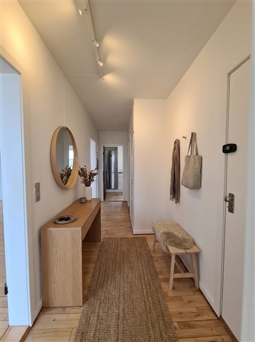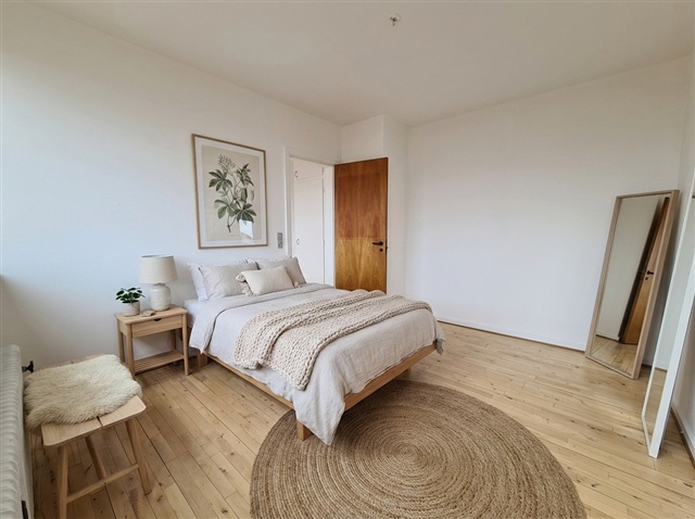 Det moderne badeværelse er ligeledes lyst og indrettet med en ny, nutidig stil, der harmonerer med lejlighedens øvrige funktioner. Overalt i boligen ligger lyse, massive birketræsgulve, som skaber en gennemgående og elegant sammenhæng. Store vinduespartier er strategisk placeret for at sikre et rigt indfald af naturligt dagslys gennem hele lejligheden.