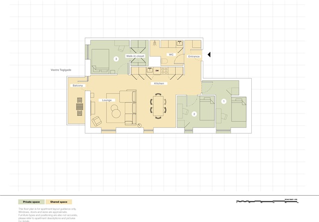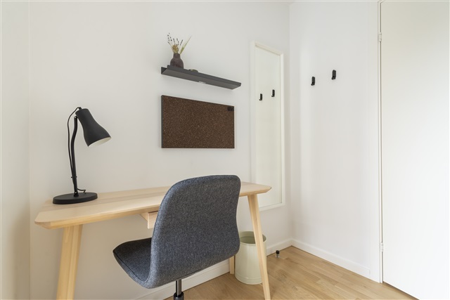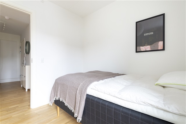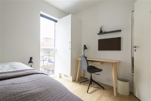 Lejligheden 'Aurora' finder man på 1. sal i en nyopført bygning beliggende på den naturskønne ø Teglholmen i Sydhavnsområdet. Boligen indeholder tre separate soveværelser, et rummeligt badeværelse til fælles brug samt en opholdsstue med et moderne, åbent køkken og tilhørende terrasse.Der medfølger en kvalitetseng, komplet med dyne, pude og sengetøj, samt et natbord udstyret med læselampe. Hvert værelse rummer også et skrivebord med kontorstol og skrivebordslampe, ligesom der er en garderobe med både bøjlestang og skuffer til opbevaring. Under sengen findes desuden opbevaringskasser. Gardiner, spejl, vasketøjskurv, skraldespand, tæpper og pynteting følger ligeledes med i lejligheden.