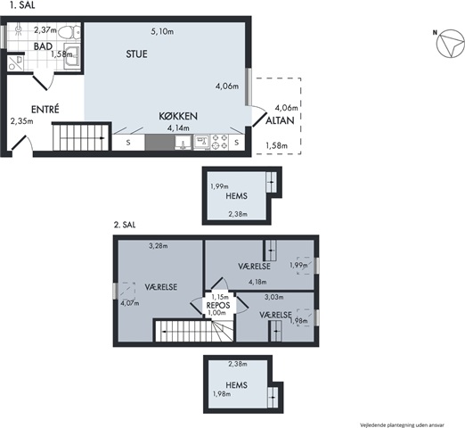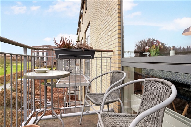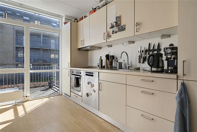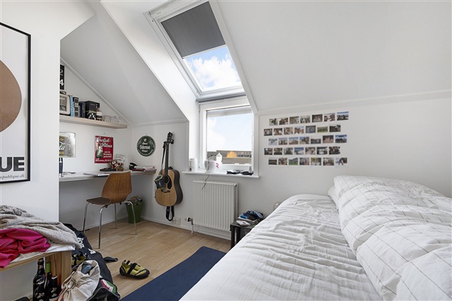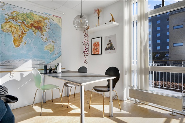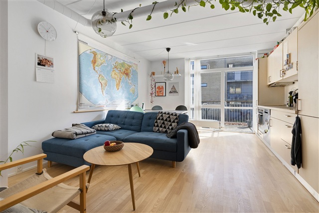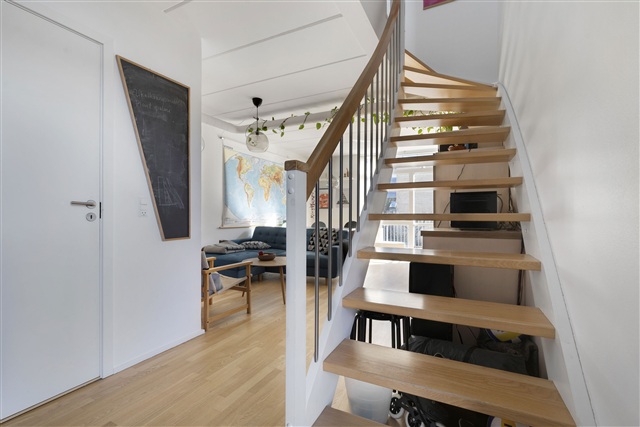 Indgangen til lejligheden sker gennem entreen, som fører ind til stueplanets åbne køkken-alrum, der er udstyret med alle nødvendige hvidevarer såsom et kombineret køle- og fryseskab, ovn, kogeplade samt opvaskemaskine. Badeværelset er indrettet med gulvvarme og har en vaskesøjle til eget brug. På førstesalen er der tre værelser af god størrelse, hvoraf to rummer hems. Fra køkken-alrummet er der desuden udgang til en privat altan. Lejligheden rummer også et depotrum til opbevaring. Det er muligt at holde hund eller kat i boligen efter nærmere aftale.