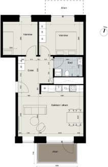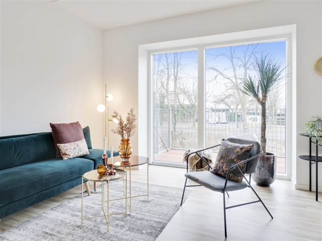 Lejligheden byder på en åben entré med indbyggede skabe. Herudover en lys og behagelig dagligstue med direkte adgang til den store vestvendte altan. Stuen ligger i åben forbindelse med spisekøkkenet, som er udstyret med alle nødvendige hårde hvidevarer og rigelig skabsplads. Badeværelset er rummeligt og indeholder bruseniche samt vaskemaskine og tørretumbler. Endelig findes to store og lyse værelser, hvoraf det ene har indbyggede skabe.