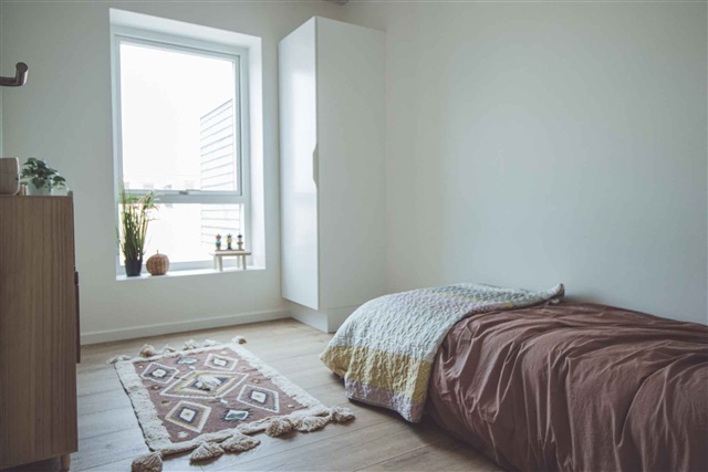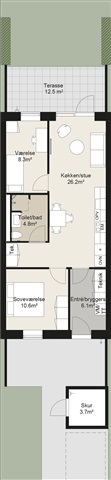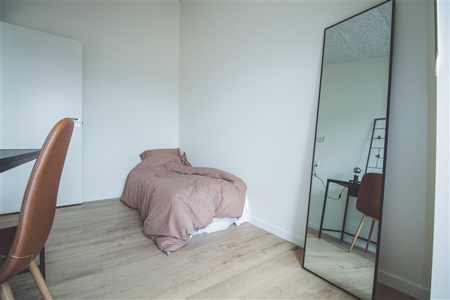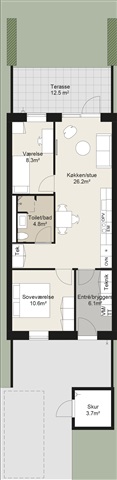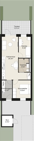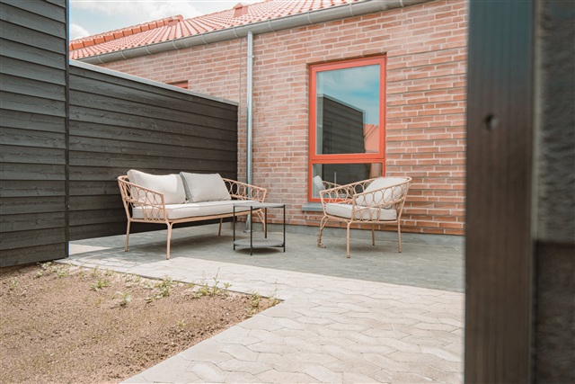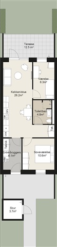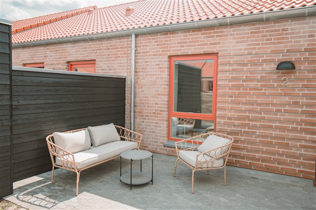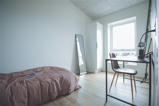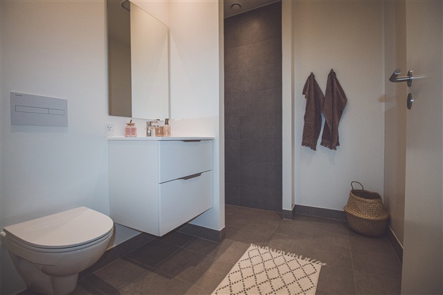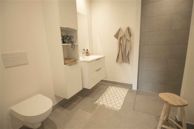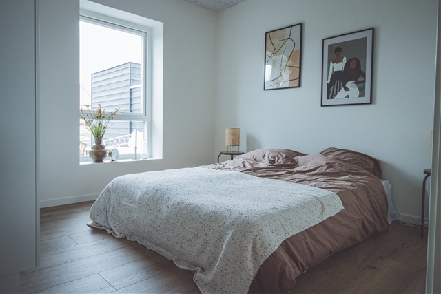 Boligen indeholder to værelser, hvor soveværelset har tre faste garderobeskabe og udsigt til forhaven. Det andet værelse, som kan anvendes som børneværelse, kontor eller gæsteværelse, har også garderobe og en fin udsigt til terrassen. Badeværelset, som er holdt i lyse og moderne materialer, er udstyret med en bruseniche, toilet, håndvask og god opbevaringsplads, hvilket gør rummet både funktionelt og æstetisk tiltalende.