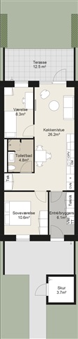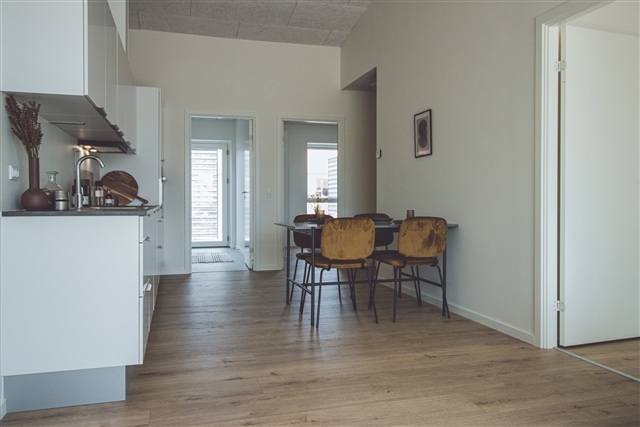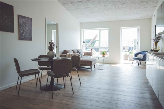 Midt i det grønne og fredelige Sejling kan du finde dette velbelyste rækkehus, som byder på en af områdets mest attraktive udsigter. Her tilbydes et tidssvarende hjem, der består af to rummelige værelser, et åbent køkken-alrum, et badeværelse samt en entré kombineret med bryggers. Både forhaven og terrassen giver fine muligheder for at opholde sig udendørs og nyde omgivelserne.Husets centrale plads er det åbne rum, hvor køkken og stue smelter sammen til en stor, lys og indbydende flade. Det moderne køkken er udstyret med alle nødvendige hårde hvidevarer og byder på rigelig plads til madlavning og samvær. Her er desuden plads til et spisebord, mens stuen fungerer som et roligt og hyggeligt opholdsområde. De store vinduespartier sikrer et godt lysindfald og giver samtidig mulighed for at nyde udsigten, og fra stuen er der direkte udgang til terrassen, hvor udendørsmåltider kan nydes på varme dage.