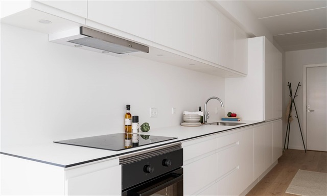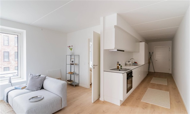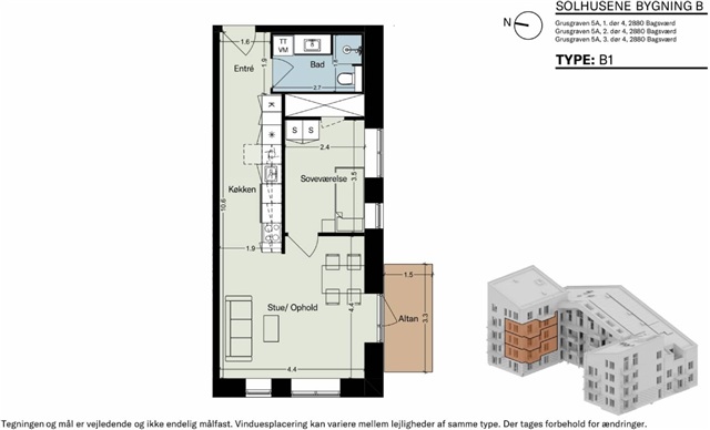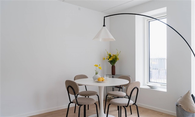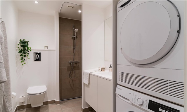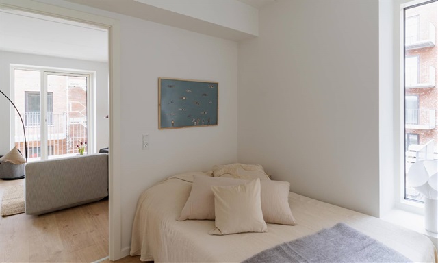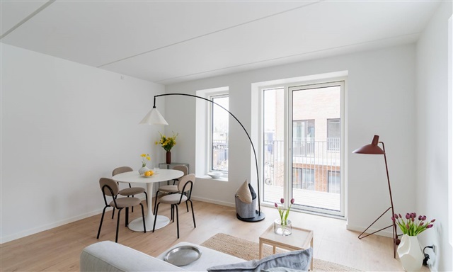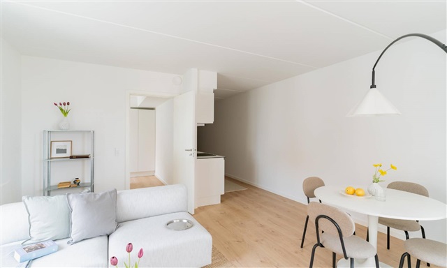 Denne lejlighed med to værelser indledes af en entré, hvor der er plads til at hænge overtøj. Herfra føres du videre ind i det åbne og lyse køkken-alrum, som rummer et hvidt Invita-køkken, der smukt fremhæves af de varme egetræsparketgulve med integreret gulvvarme. Køkkenet er fuldt udstyret med moderne hårde hvidevarer, blandt andet kogeplade, køle- og fryseskab, indbygningsovn samt opvaskemaskine.Alrummet er lyst og rummeligt, hvilket giver gode muligheder for at arrangere både en spiseplads og et komfortabelt opholdsområde. Herfra er der udgang til en skøn altan med sydvendt orientering, hvor solens stråler kan nydes sammen med en forfriskning eller en varm drik. Soveværelset er funktionelt indrettet med indbyggede skabe og har tilstrækkelig plads til seng og opbevaring. Badeværelset fremstår med store, grå fliser og indeholder en separat bruseniche samt plads til både vaskemaskine og tørretumbler.