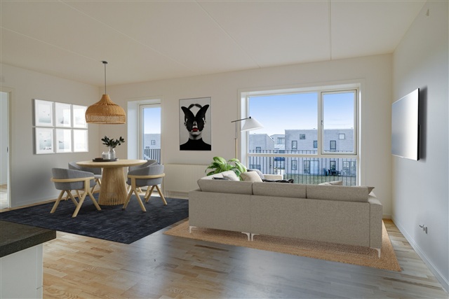 Denne lejlighed på Marshalls Allé byder på tre værelser og udlejes uden møbler, hvorfor billederne alene skal ses som forslag til indretning. Boligen fremstår lys og rummelig med adgang til en stor altan. Der medfølger et indbygget depotrum på 1,6 m², og både bil- samt cykelparkering findes i fællesområderne.Området rummer flere fælles faciliteter, herunder et legetårn til børn og flere hyggeligt placerede borde og bænke, som bidrager til et behageligt udeareal. Udlejer leverer et højt serviceniveau, der sikrer en god lejeboligoplevelse. Gulvene er udført i askelamelparket, inventaret stammer fra Invita, og køkkenet er udstyret med hårde hvidevarer fra Bosch, lige fra glaskeramisk kogeplade og ovn til opvaskemaskine samt kombineret køle- og fryseskab. Der er desuden forberedt til vaskesøjle i lejligheden, og badeværelset har gulvvarme. Hver lejlighed har enten altan eller terrasse, og bygningen har elevator samt dørtelefon. Parkeringsmuligheder for biler og cykler findes i fællesarealer ved ejendommen.