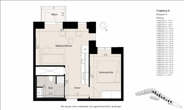 Denne nybyggede 2-værelses lejlighed er placeret i det eftertragtede Tingbjerg og byder på en lys og venlig atmosfære. Boligen indeholder et Invita-køkken, som er fuldt udstyret med alle nødvendige hårde hvidevarer. Køkkenet er integreret i et åbent alrum, der fungerer som både spiseplads og opholdsstue, hvilket skaber et praktisk og behageligt rum til hverdag og samvær.Fra alrummet er der adgang til en altan med udsigt, hvor man kan nyde omgivelsens fred. Lejligheden rummer desuden et godt soveværelse samt et flot badeværelse, der er udstyret med vaskemaskine og tørretumbler. Gulvvarme er installeret overalt i lejligheden, og beliggenheden gør det nemt at komme til offentlig transport, indkøbsmuligheder og rekreative områder, hvilket tilsammen giver en bolig, der kombinerer såvel komfort som praktisk tilgængelighed. Det skal bemærkes, at billederne kan stamme fra en anden bolig i ejendommen, hvorfor indretning, udsigt og beliggenhed kan variere, mens materialevalg og kvalitet er ens for hele ejendommen. Plantegningen viser netop denne lejligheds layout.