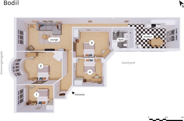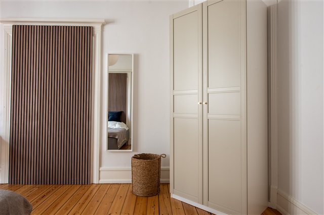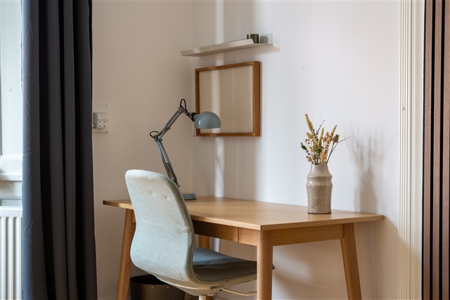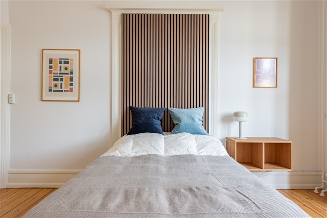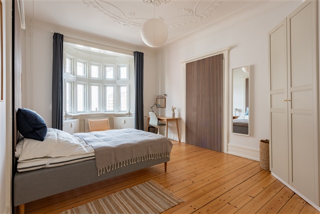 Denne flotte lejlighed gennemgik en komplet renovering i løbet af 2021. Boligen indeholder fire separate enkeltværelser samt et moderne og rummeligt badeværelse. Køkkenet er fuldt udstyret og har et stort spisebord, mens en separat, rummelig stue byder på sofa, lænestole, tv med mere. Derudover er der en privat altan med udsigt til den grønne have bagved.I hvert enkeltværelse står en seng af høj kvalitet, komplet med sengetæppe, dyne og puder. Ved siden af sengen findes et natbord med læselampe, og der er et skrivebord med stol og skrivebordslampe. Gaderoben har både skuffer og plads til hængende tøj. Under sengen er der opbevaringskasser. Til boligen hører også gardiner, spejl, vasketøjskurv, affaldsspand, måtter samt forskellig pynt, hvoraf ikke alt nødvendigvis er vist på billederne.