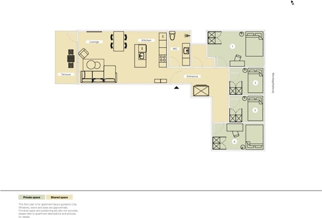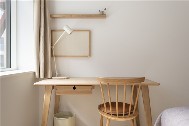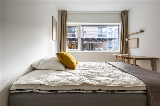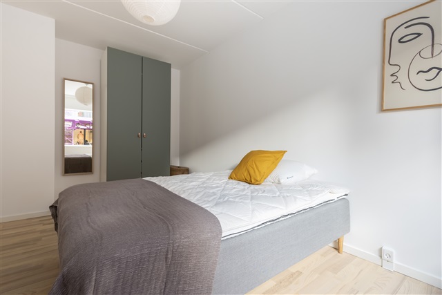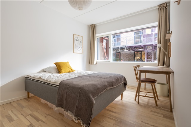 Lejligheden ligger i stueetagen i en nyere bygning i det hurtigt udviklende område Valby. Den indeholder fire separate enkeltværelser, et stort fælles badeværelse samt en stue med et moderne åbent køkken, som fører ud til en privat terrasse.Hvert værelse er udstyret med en kvalitetseng, inklusive dyne, pude og sengetøj. Der er desuden et skrivebord med tilhørende stol og skrivebordslampe samt et klædeskab med både bøjlestang og skuffer. Under sengen findes opbevaringskasser. Værelserne er endvidere indrettet med gardiner, spejl, vasketøjskurv, affaldsspand, tæpper og pynt.