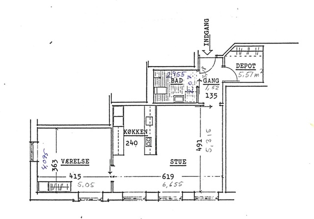 Boligen består af en entré, hvor der er et ekstra rum velegnet som enten et walk-in closet eller et kontor. Herfra er der adgang til badeværelset, som byder på en separat bruseniche og sammenklappelige låger. Desuden er der mulighed for at placere egen vaskemaskine ved siden af håndvasken.Fra entréen træder man videre ind i køkkenalrummet, som er fyldt med naturligt lys fra rummets vinduer, hvilket skaber en lys og åben atmosfære. Køkkenet er delvist afskærmet i rummet og byder på rigeligt skabsplads. Det er helt nyinstalleret i 2025 og indeholder blandt andet opvaskemaskine, et mikroovnsskjul, højt placeret ovn samt materialer af høj kvalitet.