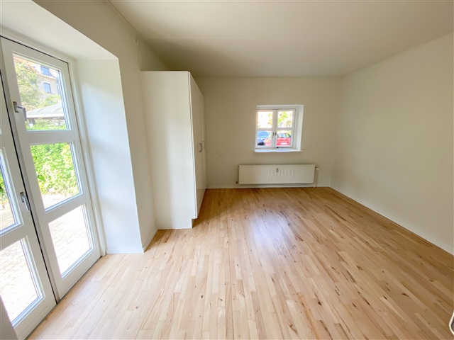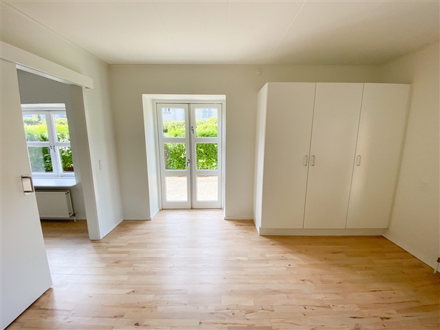 Soveværelset er rummeligt nok til en dobbeltseng og eventuelt et skrivebord og har desuden et godt klædeskab. Herfra er der udgang til en stor terrasse med sydvendt orientering. Haven omfatter en hæk, der afgrænser området, samt bede langs siderne, hvor der er plads til blomster eller lignende beplantning.
