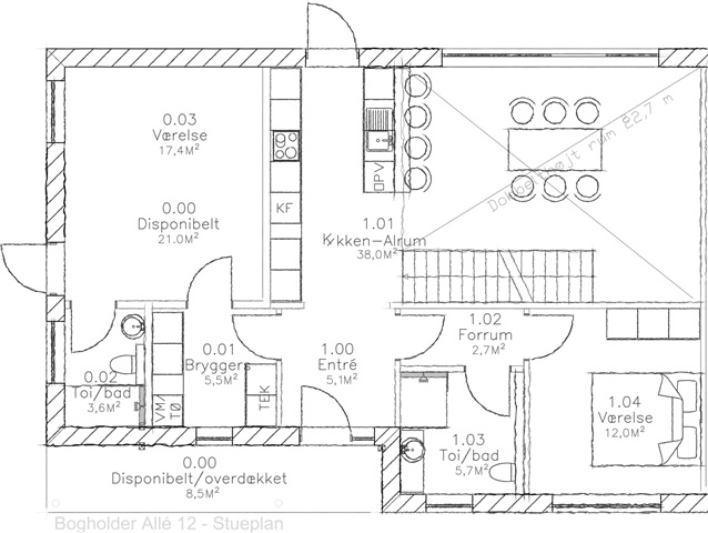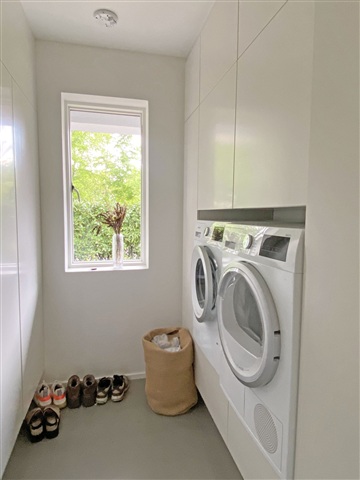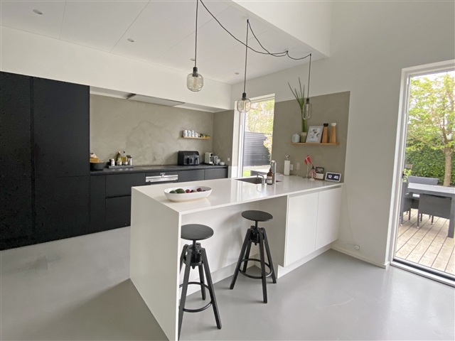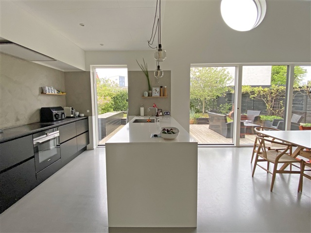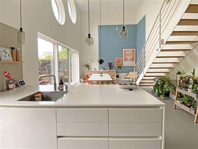 Køkken-alrummet udgør hjemmets centrale samlingspunkt, hvor den høje loftshøjde skaber en rummelig atmosfære med rigeligt dagslys. Rummet er ideelt til både hverdagens måltider og gæstebesøg, og den direkte adgang til en velplejet have forlænger opholdet udendørs i sommerperioden.