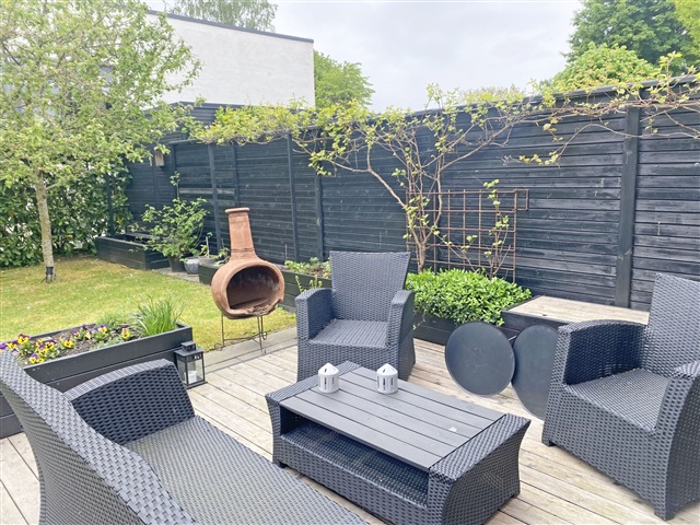 Udenfor findes desuden en privat have med terrasse, to opbevaringsrum samt æbletræer, som giver både legemuligheder og ro. Huset er energimæssigt fremtidssikret med solcelleanlæg og elbil-ladestander, hvilket understøtter både bæredygtighed og moderne behov.