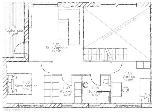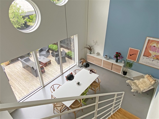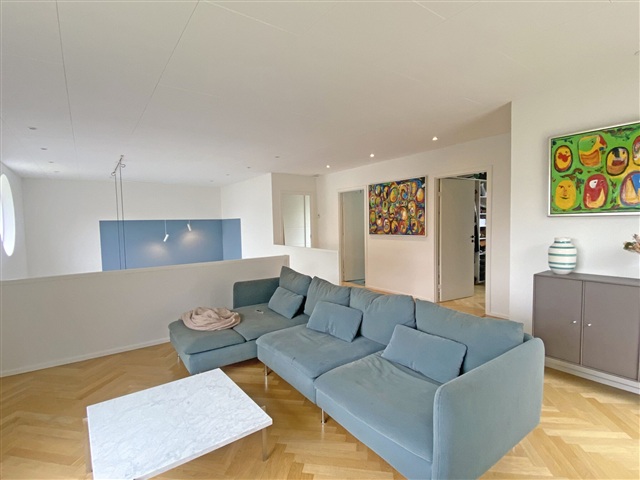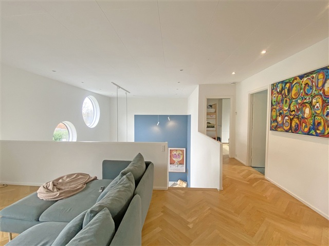 På 1. sal ligger en lys stue, som vender mod køkken-alrummet og giver en spændende sammenhæng i arkitekturen. Fra denne stue er der udgang til en sydvendt terrasse, hvor solen kan nydes det meste af dagen.