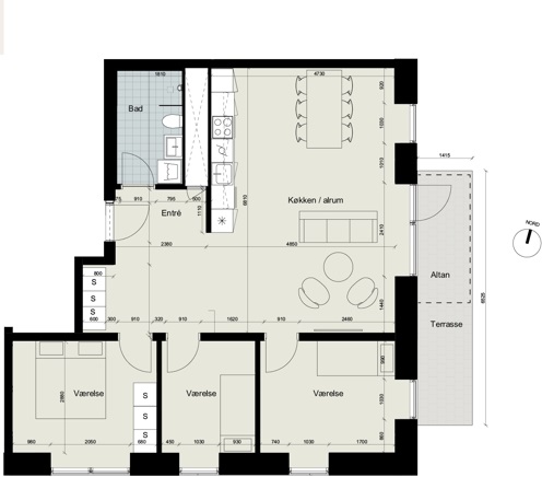 Indenfor byder lejligheden på en åben entré med indbyggede skabe, en lys og rummelig stue med udgang til en stor altan samt et åbent spisekøkken, som er udstyret med alle nødvendige hvidevarer og rigelig skabsplads. Badeværelset er rummeligt og indeholder bruseniche samt en vaskemaskine og tørretumbler. Tre store, lyse værelser hører til boligen, hvoraf ét har indbyggede skabe.