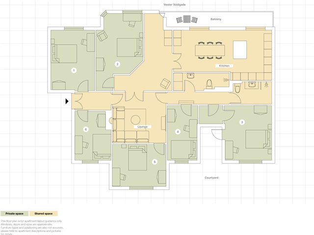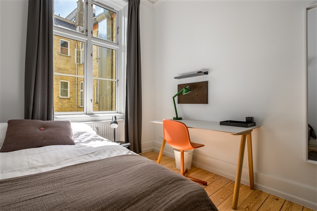 Denne charmerende klassiske lejlighed i København rummer seks værelser, hvoraf alle er enkeltværelser. Køkkenet er stort og moderne, indrettet både med spisebord og en køkkenø, som gør madlavningen praktisk og hyggelig. Lejligheden har desuden to opholdsområder - et af dem mere rummeligt mens det andet er mindre og intimt. Tilknyttet er en solrig altan samt to fælles badeværelser, der deles af beboerne.Boligen befinder sig på tredje sal med udsigt over den lyse og luftige Vester Voldgade. Placeringen tæt ved vandet gør det let at tage en dukkert i sommerhalvåret. I nærheden findes flere af byens kendte seværdigheder som Det Kongelige Bibliotek, Tivoli og Rådhuset, alt sammen lige rundt om hjørnet. Derudover er Centralstationen blot en fem minutters gang væk. På ejendommens stueetage finder man også Iboo's take-away, som tilbyder lækre retter fra det pakistanske køkken.