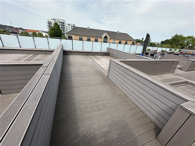 Lejligheden ligger på 1. etage, hvor der er elevator, og direkte udgang til tagterrasse, med stort privat område for den individuelle lejlighed.