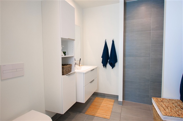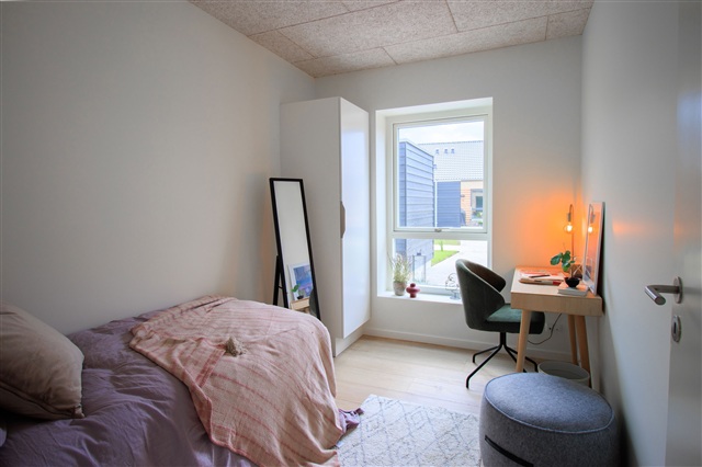 Rækkehuset rummer et lyst soveværelse med faste garderobeskabe samt to yderligere værelser, som ligeledes har garderobeplads - ideelt anvendeligt som børneværelser, hjemmekontor eller gæsteværelser. Badeværelset er indrettet med moderne og stilrene materialer, herunder bruseniche, toilet, håndvask og god opbevaringsplads, hvor både funktionalitet og æstetik er prioriteret.
