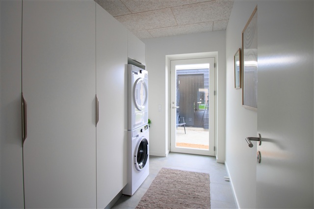 I boligens entré er bryggerset integreret, og her finder man vaskemaskine og tørretumbler, hvilket gør dagligdags opgaver mere overskuelige. Der er også god plads til opbevaring af tøj og sko i dette område.