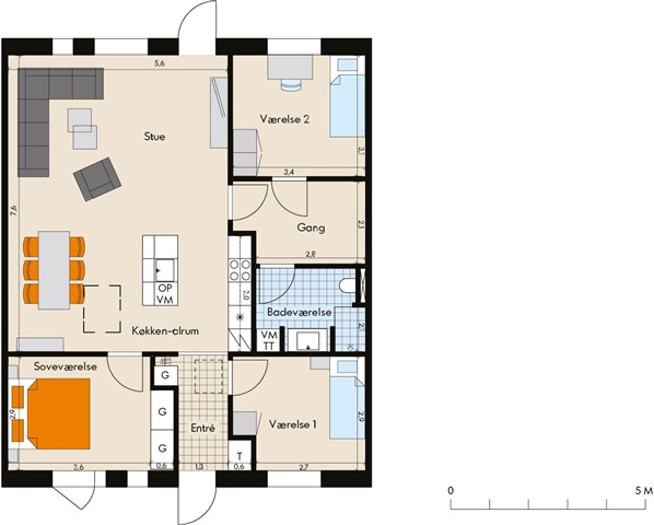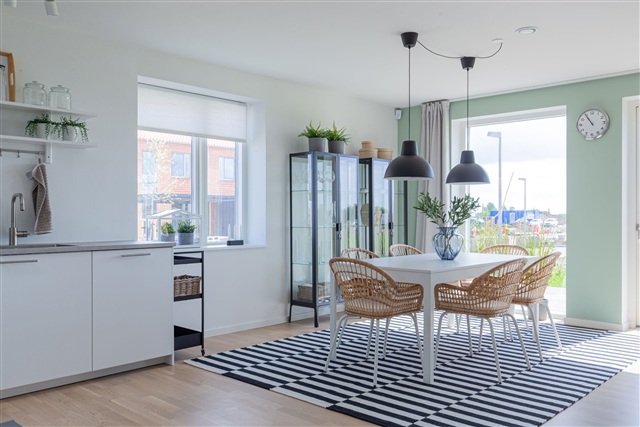 Boligen byder på en åben planløsning, hvor tre veludnyttede værelser integreres med et stort køkken-alrum, som er udstyret med en køkkenø og har plads både til spisebord og en hyggelig sofagruppe. Fra dette område er der adgang til haven, hvor en terrasse skaber et dejligt udeareal. En funktionel entré fører videre til det rummelige badeværelse, som er udstyret med en vaskesøjle. Boligens store glaspartier og glasdøre samt ovenlysvinduet lukker rigeligt dagslys ind, hvilket skaber en lys og indbydende atmosfære. Forhaven rummer et skur til opbevaring og to private parkeringspladser.Boligen er beliggende i det velorganiserede rækkehusområde Lyshøjsminde og Pilegårdsminde, som er en del af Tværhøjgård i Greve. Området er tæt placeret på både grøn natur samt indkøbsmuligheder og butikker, og det udgør en ny, levende og grøn bydel, hvor der er fokus på fællesskab og trygge skoleveje. Udover boligerne er der lagt vægt på at skabe gode rammer for naboskab, blandt andet med plads til udendørs aktiviteter som kridttegninger på vejen og loppemarkeder på fællesarealerne. I naboskabet Nærvær opfordres til gode relationer og samtaler mellem beboerne.