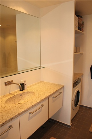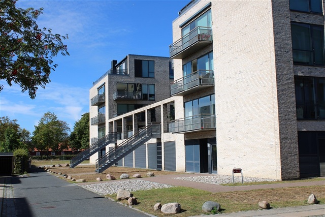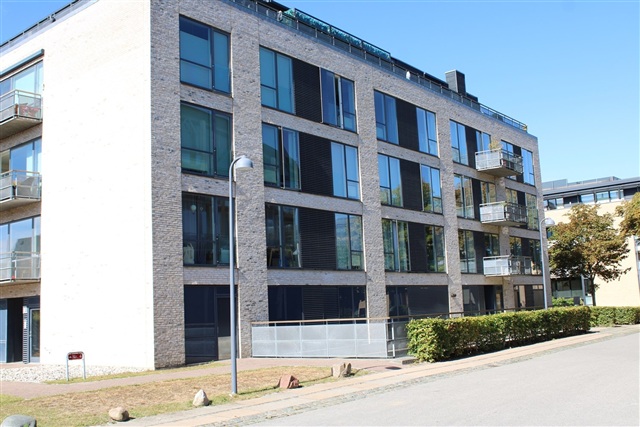 Ejendommen råder over to store værelser, begge udstyret med elegante, indbyggede skabe, der matcher stil og kvalitet fra entréns opbevaringsløsninger. Badeværelset er lyst, rummeligt og indeholder både en stor bruseniche og vaskemaskine. Det moderne udtryk fortsætter udvendigt, hvor ejendommens lyse facade og store vinduespartier sørger for maksimalt dagslys og solindfald.