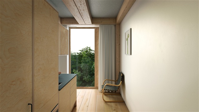 Interiøret præges af en moderne, rå stil, hvor rå betonlofter og synlige limtræssøjler giver boligen karakter, mens parketgulvet i eg tilfører varme og en naturlig elegance. De store vinduespartier sikrer et generøst lysindfald. Som beboer har du adgang til flere fællesfaciliteter, blandt andet et fælleshus med køkken, bar og toilet, som er velegnet til sociale sammenkomster. Derudover ligger en fælles gårdhave som en grøn oase mellem ejendommen og fælleshuset, og der medfølger et privat depotrum i kælderen til ekstra opbevaringsplads. Ejendommen er desuden opført med bæredygtighed og energieffektivitet for øje, hvilket blandt andet ses i tagets solcelleanlæg og husets innovative trækonstruktion baseret på Cross-Laminated-Timber (CLT).