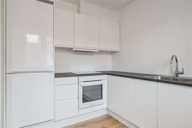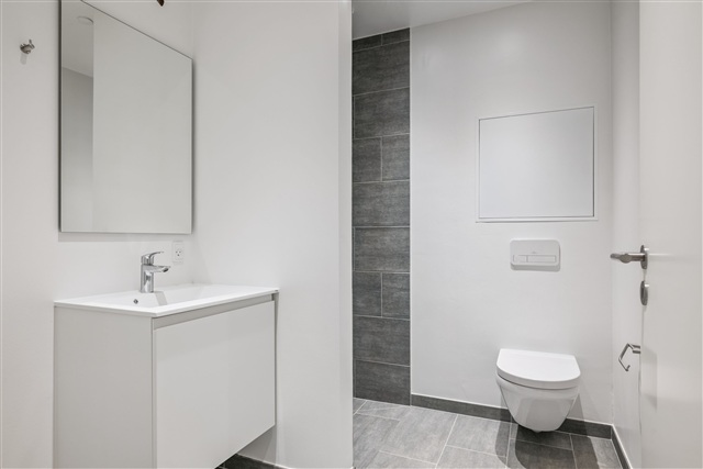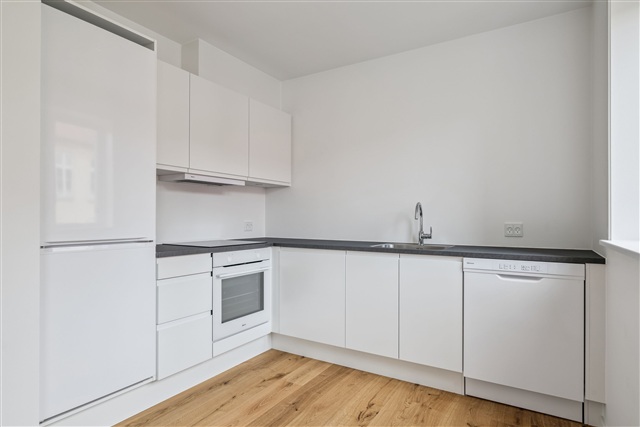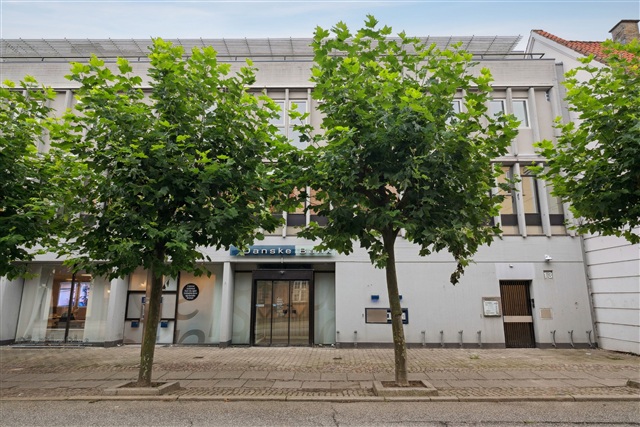 Denne lejlighed, der netop har gennemgået en komplet renovering, er beliggende i den tidligere bygning, hvor Danske Bank tidligere havde til huse. Materialevalget til boligen er lyst og robust, hvilket skaber en solid og indbydende atmosfære. Ved indgangspartiet mødes man af en entré, som giver adgang til et pænt badeværelse med bruser. Længere inde i lejligheden finder man et rummeligt køkkenalrum, som er integreret med stuen, og i den modsatte ende er der et stort soveværelse. Ejendommen har desuden elevatoradgang og råder over en stor fælles tagterrasse til glæde for beboerne.