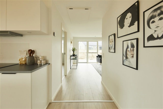 På adressen Sire Eskildsens Vej ligger et moderne rækkehus på 95 m² med en nøje planlagt indretning, hvor der er lagt vægt på både funktionalitet, komfort og rigeligt dagslys. Boligen præsenterer et køkken/alrum på 28 m², som udgør hjemmets centrale samlingspunkt. Her er der god plads til et spisebord samt hyggelige møbleringer omkring det veludstyrede køkken med HTH-elementer og integrerede hårde hvidevarer. Alrummet glider i åben forbindelse over i stuen, der gennem et stort vinduesparti bades i naturligt lys og fører direkte ud til den private terrasse og haven.Derudover indeholder planløsningen et værelse på 13,5 m² med indbygget skabsvæg, et yderligere rum på 8,3 m², et praktisk bryggers på 5,7 m², som er udstyret med vaskemaskine og tørretumbler, samt et badeværelse på 4,9 m², der byder på væghængt toilet, rummelig bruseniche og armaturer af høj kvalitet fra Hans Grohe. En separat entré skaber en funktionel og imødekommende adgang til boligen. Indretningen er domineret af lyse nordiske materialer med egeplank-laminat i opholds- og soveværelser, mens entré, bryggers og badeværelse har mørkegrå klinker, hvilket giver et moderne og praktisk udtryk. Hele boligen er udstyret med gulvvarme styret af individuelle termostater, og et ventilationsanlæg sørger for et sundt indeklima.
