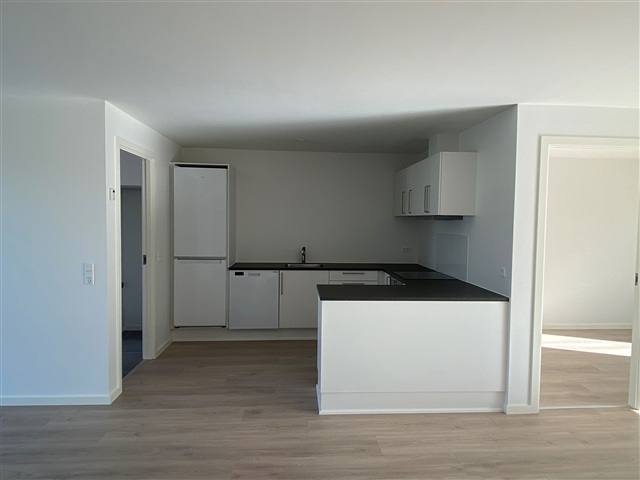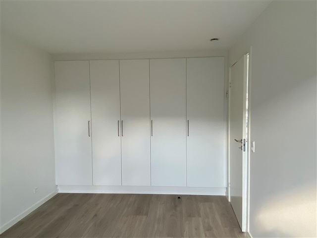 Hele boligen er udstyret med glatte, hvide døre uden dørtrin, forsynet med greb i rustfrit stål, der sikrer et ensartet og lettilgængeligt miljø. Vindueskarme er muret og vandskuret i hvid, afsluttet med simple fodpaneler. Badeværelset er udstyret med en formstøbt vask, kvalitetsarmaturer fra Hans Grohe, et væghængt Ifö-toilet samt et elegant lineært afløb i brusenichen. Gulvvarmen, der kan reguleres via trådløse termostater, findes i alle rum, og ventilationen sørger for et sundt og behageligt indeklima året rundt.