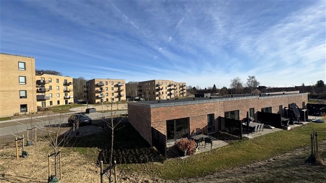 På Mosegårdsvej finder du et moderne rækkehus med en veltilrettelagt planløsning, der passer til dig, som ønsker et overskueligt hjem uden at gå på kompromis med hverken komfort eller stemning. Boligen er indrettet, så alle kvadratmeter udnyttes optimalt, hvilket skaber gode rammer for både fællesskab og private øjeblikke.Boligens centrale område udgøres af det rummelige køkken/alrum og stue, der tilsammen skaber hjemmets samlingspunkt. Her er plads til et stort spisebord, en hyggelig sofakrog og et roligt hverdagsliv, hvor aktiviteterne glider naturligt ind i hinanden. Fra stuen er der direkte adgang til en af terrasserne, hvilket gør det nemt at kombinere måltider og afslapning i det fri. På husets modsatte side er der en ekstra terrasse, ideel til at skifte opholdssted alt efter vejr og vind.