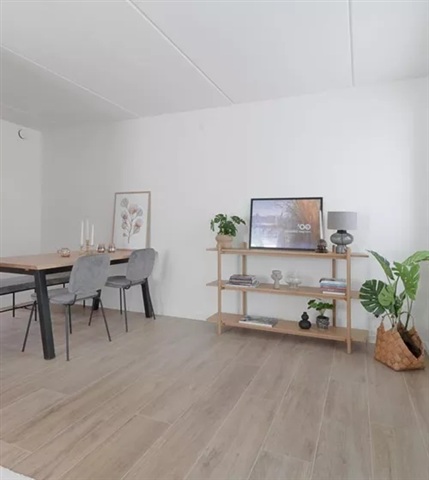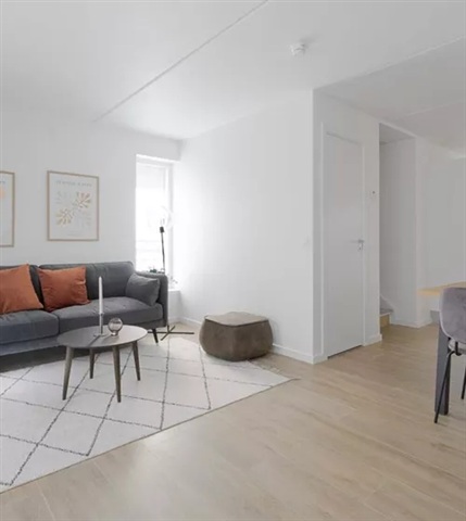 Rækkehuset strækker sig over to etager og indeholder i alt tre værelser. Det skal bemærkes, at både billeder, plantegninger og visualiseringer er vejledende og kan derfor afvige fra det faktiske.I stueetagen er køkken og stue samlet i et åbent, sammenhængende rum. Køkkenet er placeret langs en væg og er udstyret med moderne hvidevarer samt lyse overflader, som bidrager til et enkelt og praktisk udseende. Der er tilstrækkelig plads til både et spisebord og et sofaarrangement. Fra opholdsrummet er der direkte adgang til terrassen, som skaber en naturlig forlængelse af boligens indendørs rum ud mod haven.