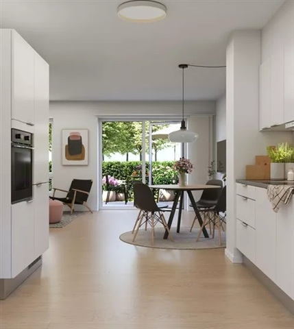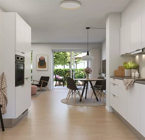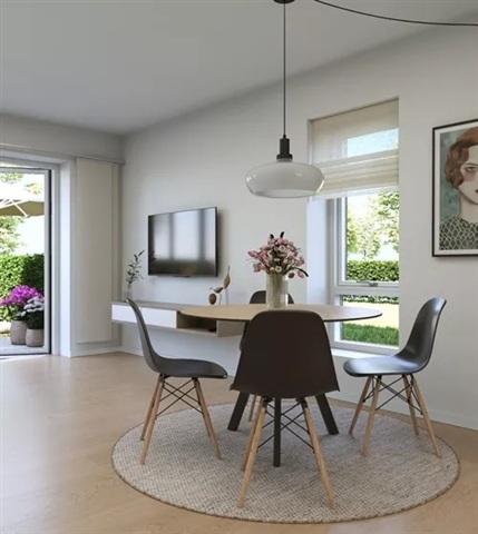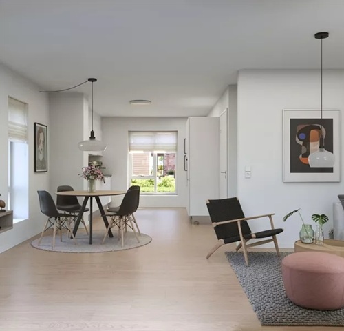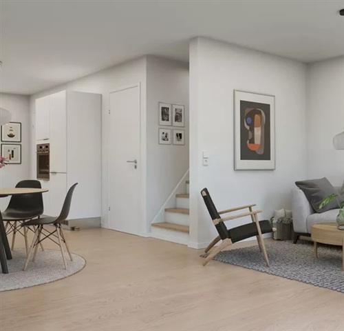 Dejligt 4-værelses rækkehus i 2-plan. Værelserne er placeret på 1. sal. Obs. alle billeder, plantegninger og visualiseringer er vejledende. Denne bolig er spejlvendt ift. plantegningen.Køkken og stue