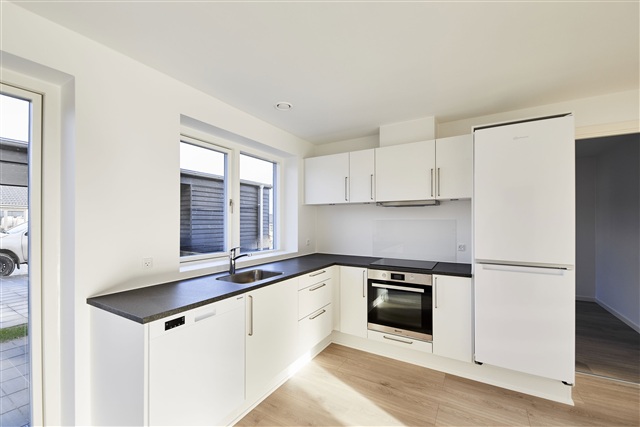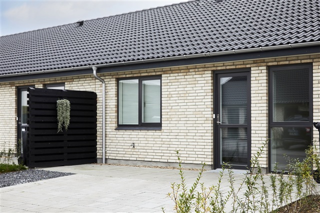 Boligen byder på et lyst og fredeligt miljø, hvor den gennemtænkte planløsning gør dagligdagen overskuelig. Ved indgangen mødes du af en inviterende entré, som forbinder hele huset og fører dig direkte videre til det rummelige køkken-alrum og stueområde. Køkkenet er udstyret med god plads til bordplads, og her er naturligvis plads til et langbord samt en komfortabel opholdszone, hvor dagslyset let strømmer ind. Fra stuen åbner terrassedøren ud mod en flisebelagt terrasse og et aflukket udeområde - ideelt til morgenkaffen, krukker med planter og afslappede sommeraftener.I den rolige del af huset findes to værelser på omtrent 10,5 m² og 11,2 m², der kan anvendes som soveværelse, børneværelse eller hjemmekontor alt efter behov. Badeværelset er godt udnyttet med separat bruseniche og er forberedt til at rumme en vaskesøjle, hvilket gør det nemt at håndtere tøjvasken. Fra entréen er der også adgang til teknikrum og smarte opbevaringsløsninger, så hjemmet hele tiden fremstår ryddeligt.