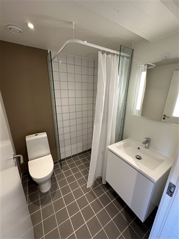 Der er plads til et mindre spisebord samt en seng eller en sofa, alt efter eget ønske. Badeværelset fremstår ligeledes utrolig fint med pæne, lyse materialer og separat bruseniche.