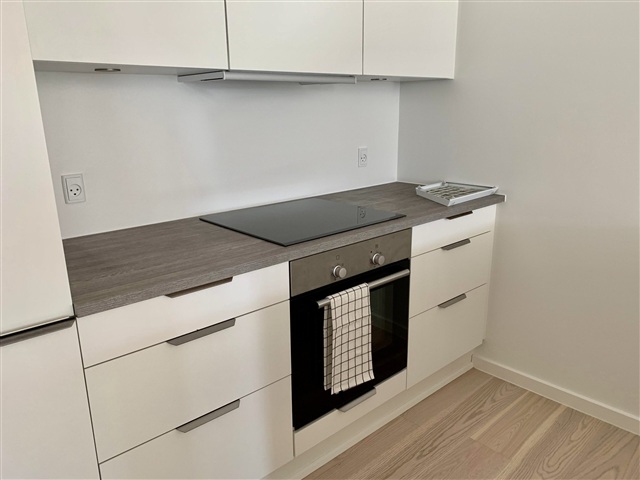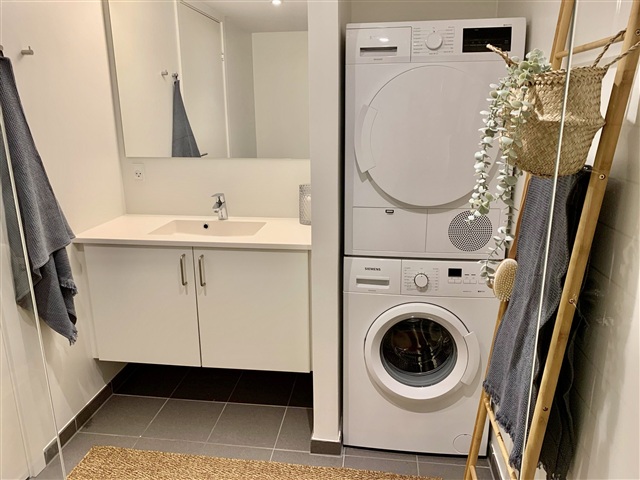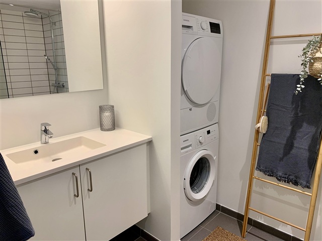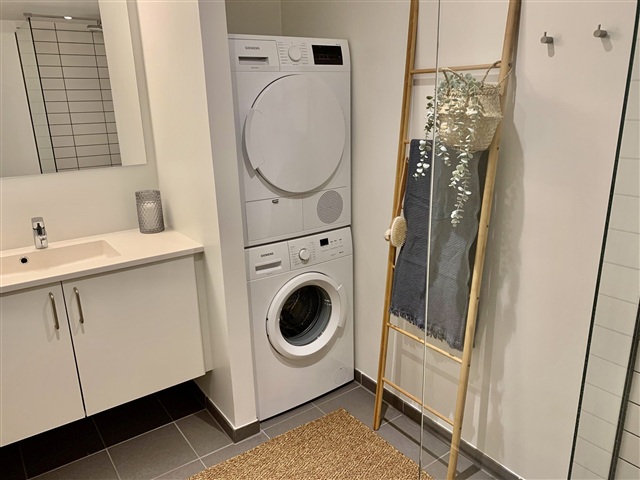 Lejligheden er udstyret med hårde hvidevarer, herunder opvaskemaskine, der gør hverdagen lettere.