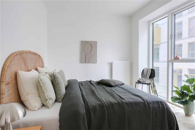 Soveværelset er en rigtig fin størrelse, og begge rum har store vinduespartier, som giver et dejligt lysindfald og skaber en lys og åben atmosfære. Badeværelset er dejligt rummeligt.