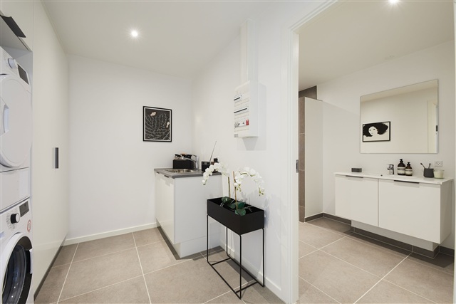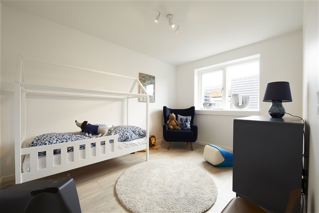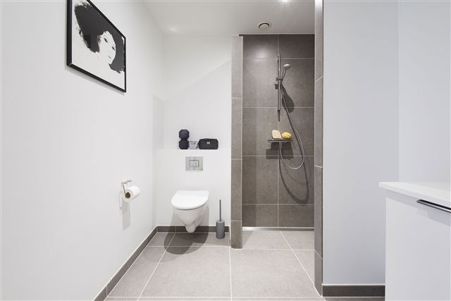 Der er lagt vægt på gode detaljer over hele boligen. I køkken, badeværelse, bryggers og soveværelse er der installeret moderne HTH-skabselementer med en glat, hvid overflade og rustfri greb. Bordpladerne er praktiske laminater i farven 'rustik skifer' og har rummelige vasker i stål. Bag kogepladen sidder en stænkplade, som gør rengøringen lettere. Badeværelsesvasken er fremstillet af formstøbt materiale, toilettet er væghængt fra Ifö Sign, og armaturerne er af høj kvalitet fra den tyske producent Hans Grohe. Brusenichen er forsynet med linjeafløb.