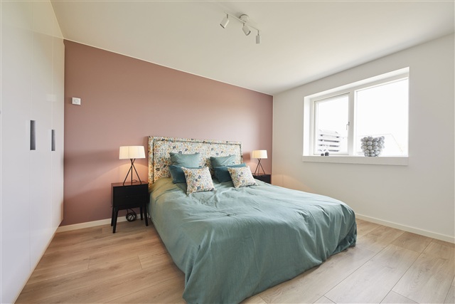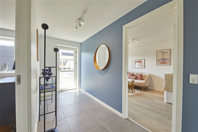 Samtlige rækkehuse fremstår lyse og åbne med hvide, glatte lofts- og vægflader. Vinduerne er velplacerede og giver et generøst lysindfald overalt. Gulvene består af egeplanker (laminat) i køkken/alrum, stue og værelser, mens entre, bryggers samt badeværelse med bruseområde er lagt med mørkegrå, neutrale klinker. Dørene er udført i hvid glat finish med greb af rustfrit stål og uden dørtrin, hvilket sikrer nem adgang mellem rum. Vindueskarme er murede og hvid vandskurede, mens væg-til-gulv afsluttes med hvide, glatte fodlister.