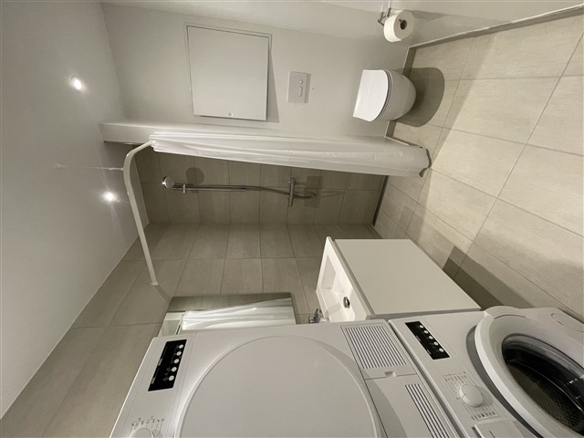 Badeværelset er flot indrettet med store klinker og har både vaskemaskine, tørretumbler og bruseniche.