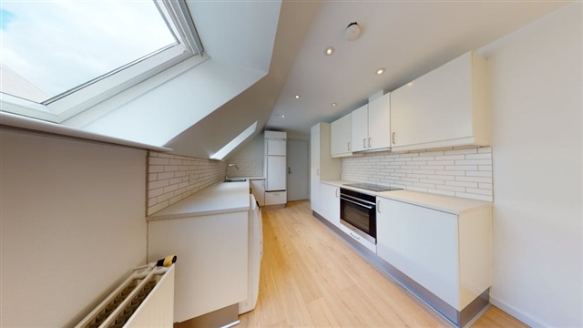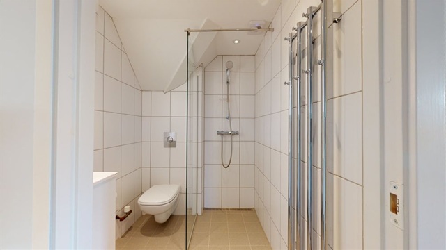 Køkkenet er praktisk indrettet og udstyret med nødvendige faciliteter, hvilket gør madlavningen til en fornøjelse. Badeværelset er funktionelt og indbydende, hvilket fuldender boligens komfort.